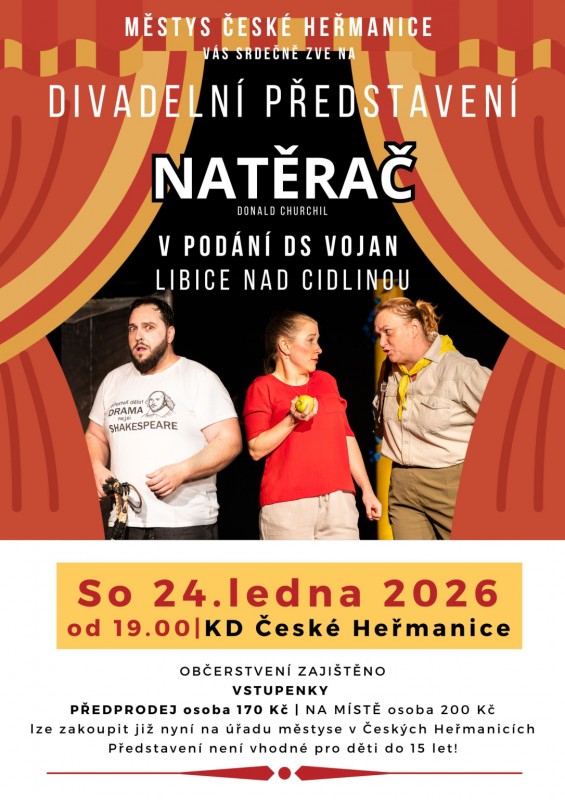 kulturní komise městyse České Heřmanice Vás chce pozvat na divadelní představení Natěrač (Donald Churchil) v podání divadelního spolku VOJAN Libice nad Cidlinou.
