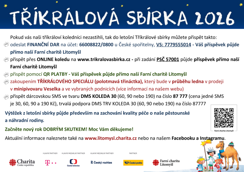 Dne 06.01. 2024 budou po naší obci chodit tříkráloví koledníci. Pokud Vás nezastihnou doma, můžete do sbírky přispět i takto:
