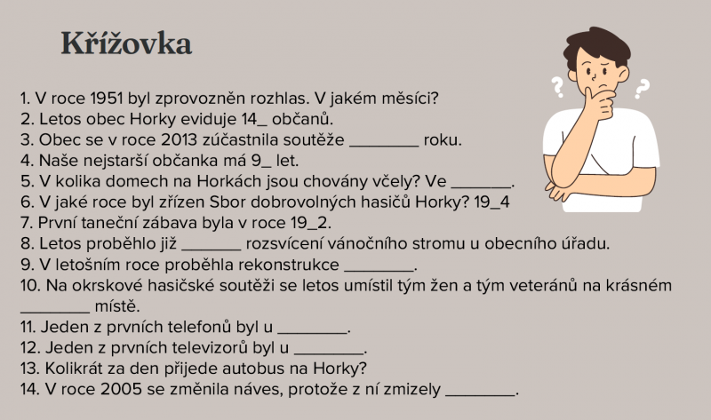 5. Pokud kouknete na naše stránky do sekce "Obec Horky" dočtete se, v jakém roce byl křížek postaven.